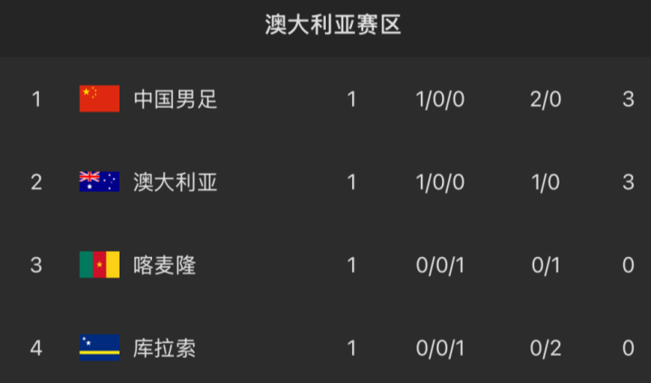 首轮战罢,中国男足和澳大利亚同积3分,喀麦隆和库拉索同积0分。中国男足凭借净胜球上风,暂列澳大利亚赛区头名。