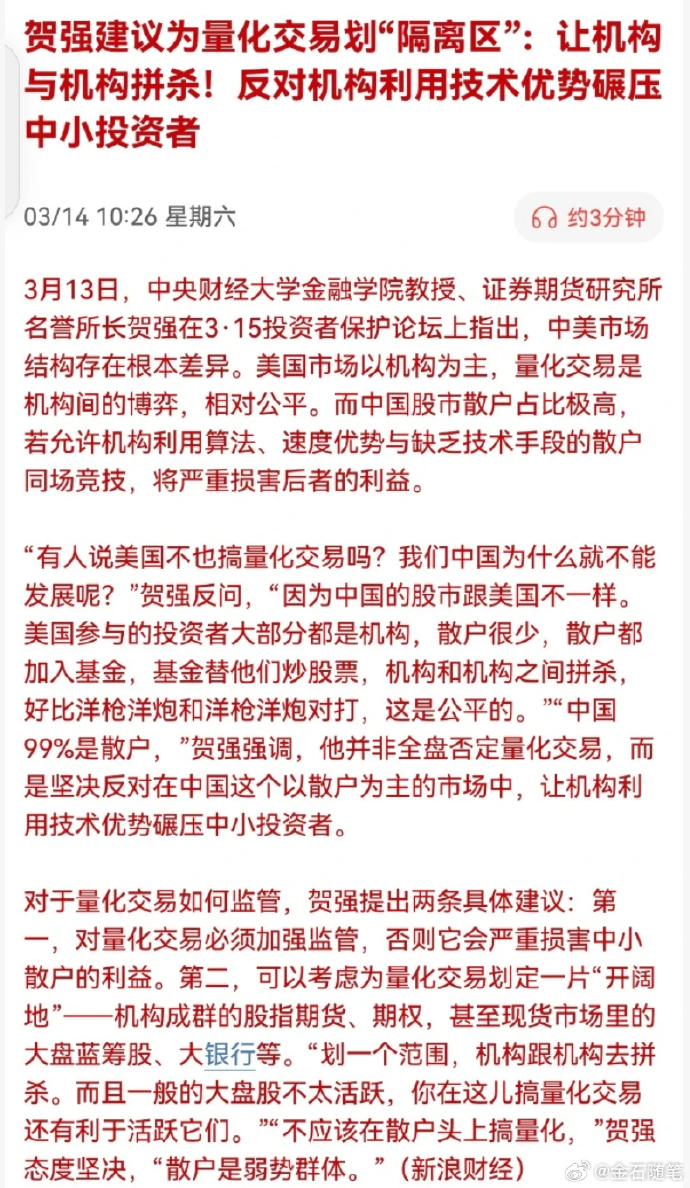 关于量化生意若何监管,贺强提倡两条具体建议:第一,对量化生意必须加强监管,不然它会严重挫伤中小散户的利益。