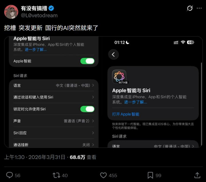 智东西3月31日音问,今天凌晨,“苹果国行AI骤然来了”的音问短暂刷屏,部分iPhone用户发现我方的系统确立里骤然多了“Apple智能与Siri”的选项,何况是不错开启的。
