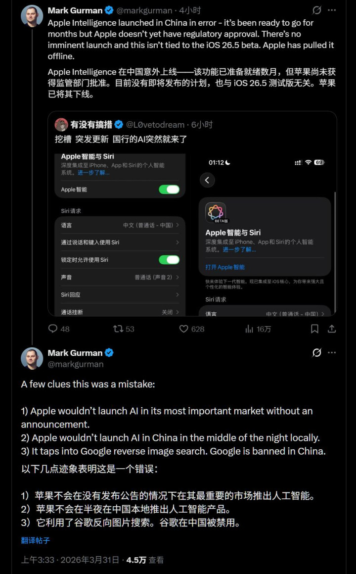 古尔曼提议了三点迹象标明苹果国行AI上线是一个“空虚”: