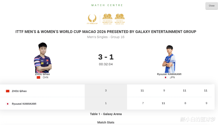 北京技术3月30日,2026年澳门寰球杯小组赛,国乒宿将周启豪3-1轻取日乒小将川崇高星,四局比分:11-7、9-11、11-8、11-9。周启豪拿到了小组赛的第一场告捷仍是手持晋级的优先权。