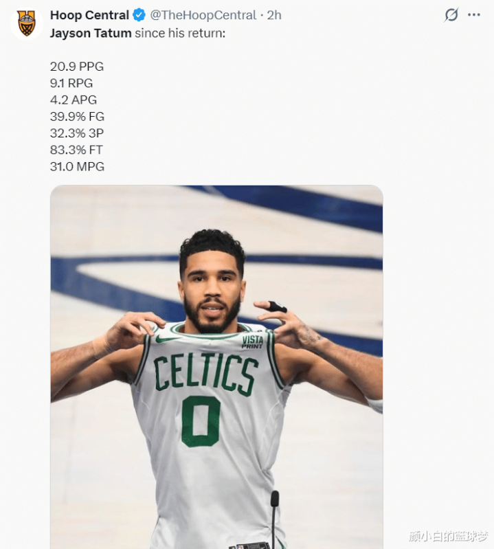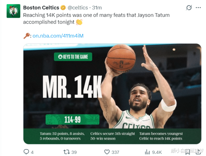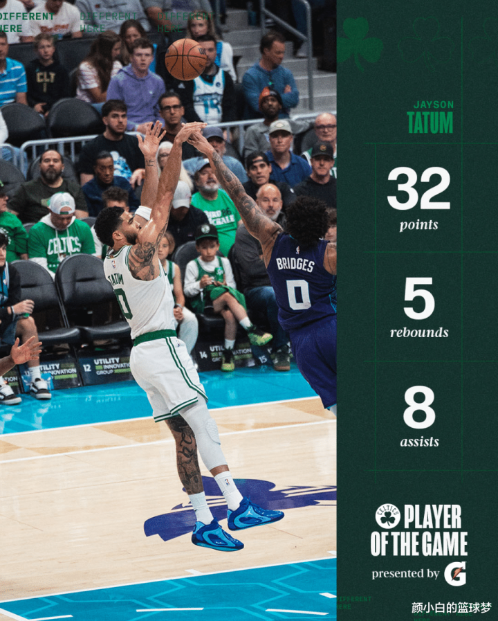 绿凯官方晒出记录:1.塔图姆赛季新高的32分,亦然本赛季初度30+,上一次30+是客岁5月13日季后赛的42分;