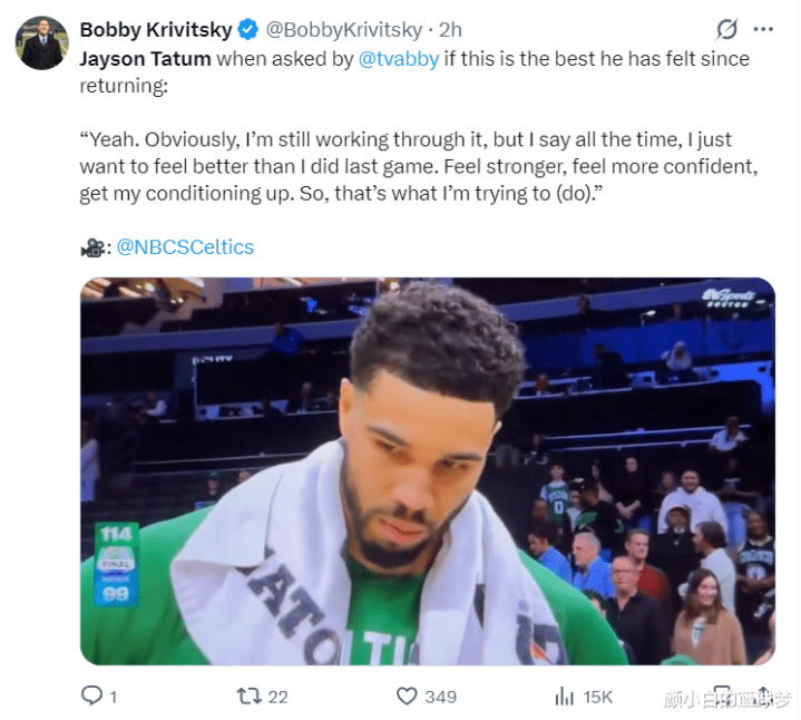 赛后塔图姆接管采访,他暗示:这场比赛着实是我方复出以来最好景色,我方一直王人在克服伤病带来的格局颤抖感。我一直告诉我方要比上一场发达出色,豪门国际要嗅觉我方更结实,更有信心,提高我的体能水平。现在我正在冉冉的更动与复原我方的竞技景色。