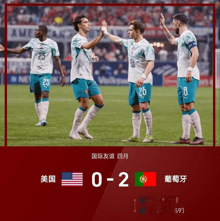 4月1日 26赛季海外友谊四月,葡萄牙对阵好意思国。全场比赛,C罗缺席,特林康、菲利克斯破门立功,B费助攻双响。最终全场适度,葡萄牙2-0打败好意思国。