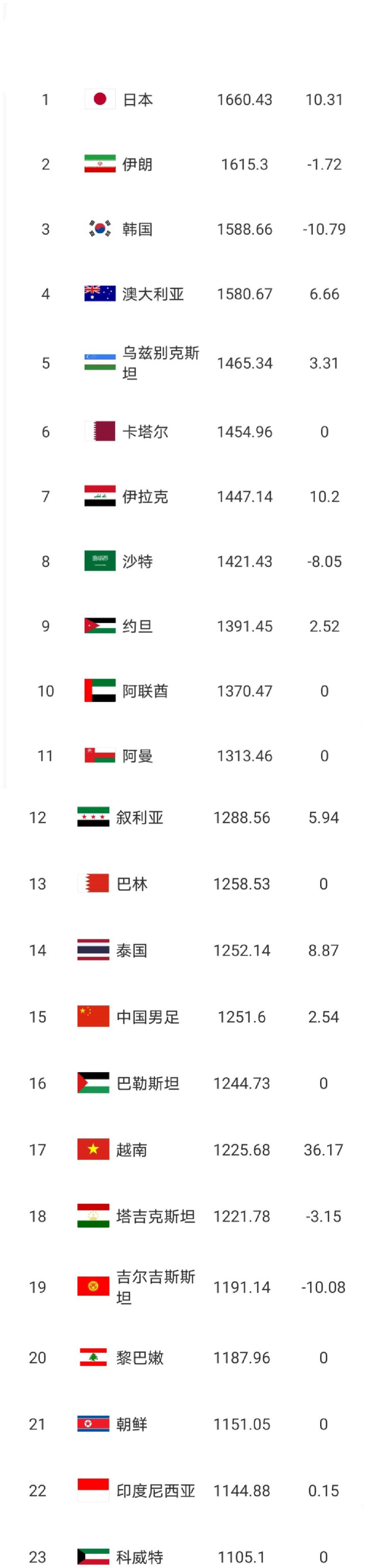 中国女足高涨 1 位至第 16 位,亚足联内名顺序 4 位,仅次于日本、朝鲜、澳大利亚。韩国女足位列第 19 位。