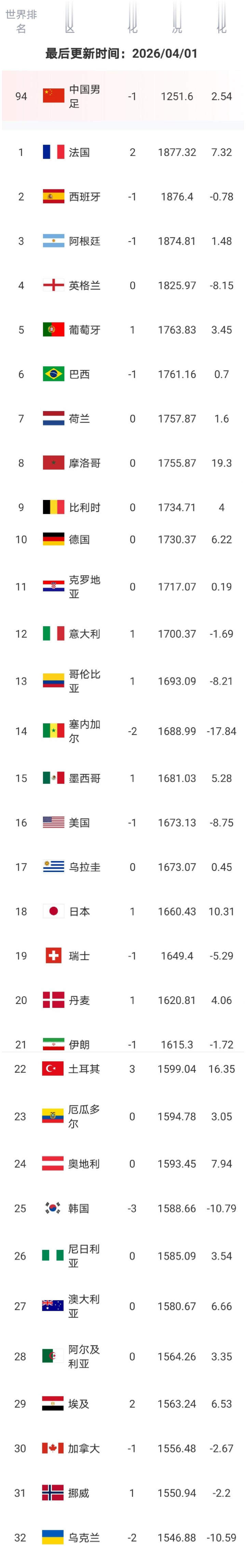 北京技巧 4 月 1 日,海外足联公布 2026 年 3 月海外比赛日后男足、女足最新寰球名次。环球足坛样子剧烈震憾,传统豪强再行洗牌;亚洲区双线分化,日口头跑、中国男足位次下滑,中国女足稳步高涨。