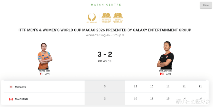 北京时辰3月30日,2026年澳门寰球杯小组赛,日乒选手伊藤好意思诚3-2险胜加拿大宿将张默,五局比分:12-10、10-12、13-11、11-4、11-4。这场比赛伊藤好意思诚在大比分1-0越过的情况下连输两局,在37岁张默体能下滑后伊藤好意思诚才连扳两局拿下得手。