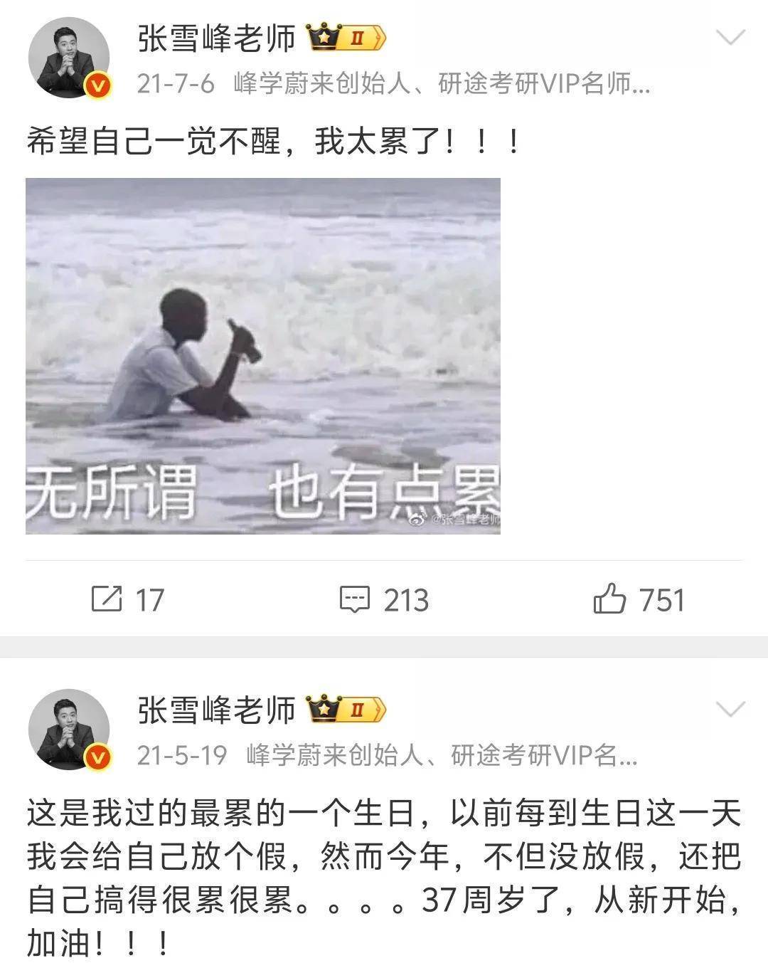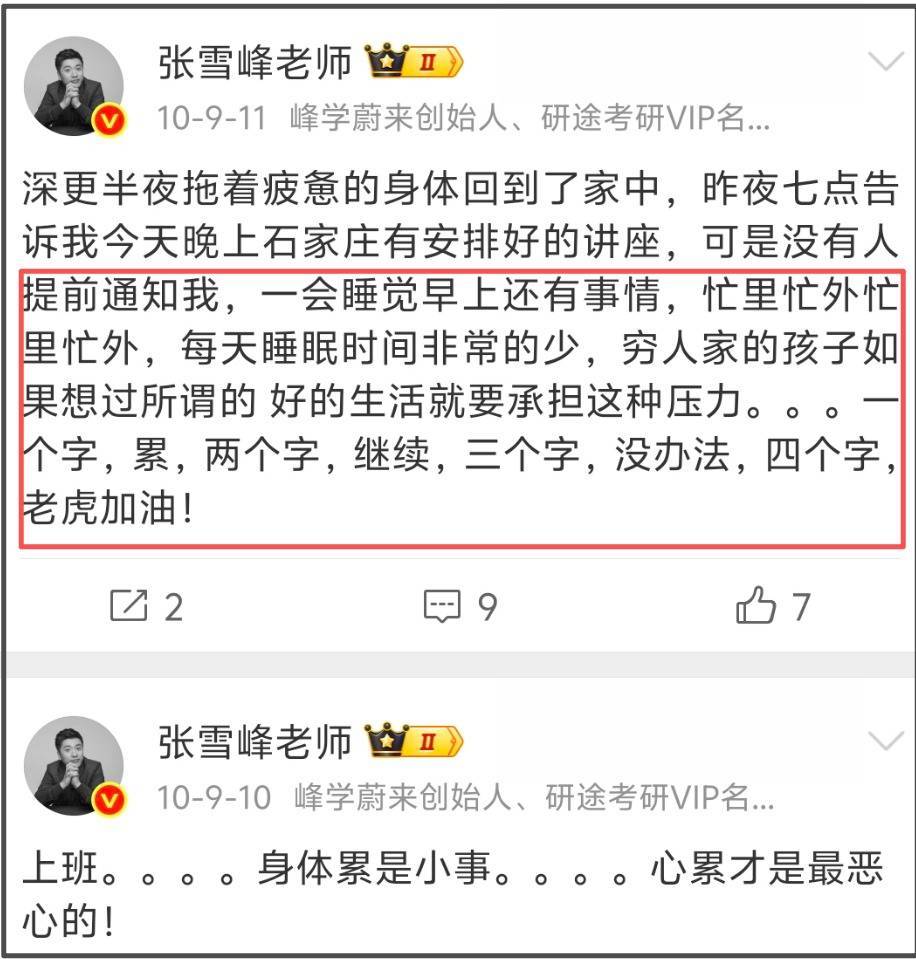 回来张雪峰的东谈主生轨迹,一切似乎早有预兆。从2009年启动使用微博第二天,他就发了一条"wokuaisile"。十几年技艺里,他发了几十条喊累的微博,早年非日非月到处跑线下讲座,累到不想活命,累到想哭。走红之后职责量更大,连过生辰王人认为累。2016年,张雪峰微博第一次出现了"暴毙"两个字,他今夜没睡坐在机场担忧着、感叹着,雅博体育app但愿我方不要暴毙。