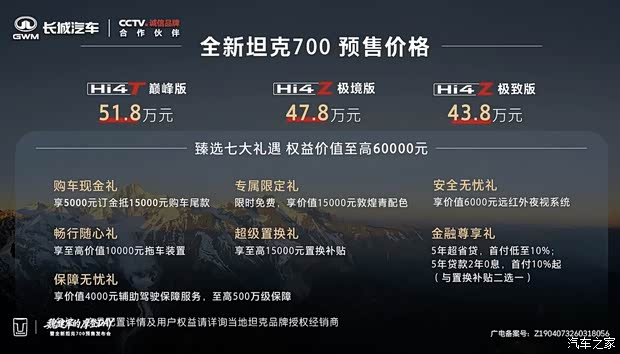 [汽车之家资讯]3月30日,咱们从官方获悉,新款坦克700Hi4-T/Hi4-Z雅致开启预售,Hi4-T推出一款车型,预售价为51.8万元;Hi4-Z共推出两款车型,预售价分袂为43.8万元和47.8万元。新车在外不雅方面进行了小幅优化,同期配备了激光雷达,Hi4-T配备非解耦四驱结构,主打强悍越野性能,Hi4-Z主打泛越野属性。